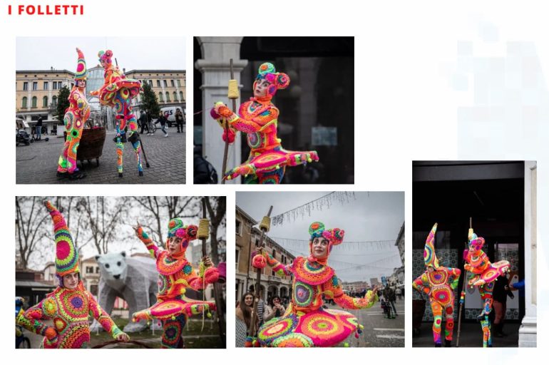 I folletti crochet sono i “folletti della lana, giocando con fili e gomitoli creano collegamenti, uniscono persone e cose… creano un cerchio tra il pubblico e invitano solo alcuni scelti accuratamente a pescare un biglietto speciale, una frase che arriverà proprio a chi la stava aspettando. Lasciti coinvolgere da questa performance, i costumi sono stati realizzati partendo dal materiale meraviglioso della street artist Licia